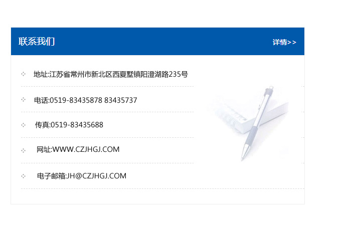 地址:常州市新北區友邦商務大廈1幢16、17層  電話:0519-85101652  傳真:0519-85112595  郵編:213022  網址:www.cz-jiayue_cn.nmyghb.com  郵箱:xiajifengaa@163.com